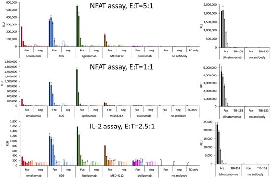 T-cell activation assays with Ramos-Fcε—targeting BiTE-like fragments: T-cell activation as a response to IgE-targeting BiTE-fragments using graded concentrations of BiTE starting with 400 pM for omalizumab-, MEDI4212-, and quilizumab-based molecules, and 2 nM for 8D6- and ligelizumab-based BiTEs (full bars: Fcε-cell line, empty bars: control cell line) and T-cell activation caused by dilutions of blinatumomab starting at 1 nM, when bound to Ramos-Fcε cells with the response of TIB-153 as a negative cell line. NFAT: nuclear factor of activated T cells, IL-2: interleukin 2, E:T: effector to target cell ratio.