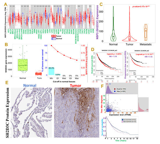 The impacts of cancer incidences and mortality are increasing at a global level. An estimated 19.3 million new cancer cases and almost 10.0 million cancer deaths occurred in 2020 [1]. Messenger (m)RNA expressions play important roles in cancer cell progression and survival, and comparative gene expression profiles between tumors and adjacent tissues have been very useful in identifying potential cancer biomarkers [65,66]. Our results suggest that NSP3 (SH2D3C) is differentially expressed in different cancer types and thus could serve different prognostic purposes in different cancer types. As such, different therapeutic approaches must be considered when targeting NSP3 (SH2D3C) in different cancer types. Controversial roles of proteins in different cancer types have been reported in previous studies; for instance, EPHB4 was described as an oncogene in some cancers and as a tumor suppressor in other cancers [67,68,69]. These contradictory findings suggest a complex role of NSP3 signaling in cancer, characterized by multi-domain and multifunctional properties. Specifically, our differential expression and survival analyses strongly suggested that NSP3 (SH2D3C) is a potential biomarker of advanced stages of lung cancer.