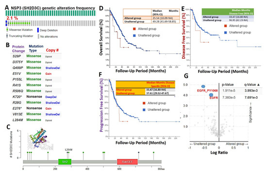 Genetic alterations of non-structural protein 3 (NSP3; SH2D3C) are associated with poorer prognosis and inversely associated with Epidermal Growth Factor Receptor (EGFR) alterations in lung cancer patients. Genetic alteration profile of NSP3 (SH2D3C) in lung adenocarcinoma. (A) Prevalence and distribution of NSP3 (SH2D3C) genetic alterations in lung adenocarcinoma cohort. (B) Specific mutation types of NSP3 (SH2D3C) in lung adenocarcinoma cohorts. (C) Lollipop plot of NSP3 (SH2D3C) mutation location in lung adenocarcinoma cohort across the cBioPortal for Cancer Genomics dataset. Mutations are color-coded as missense, truncating, and in-frame mutations. (D) Kaplan–Meier plot of the (D) shorter overall survival (E), disease-free survival, and (F) progression-free survival between lung cancer cohorts with genetically altered and cohorts without altered NSP3 (SH2D3C). (G) Heat map of NSP3 (SH2D3C) mutation co-occurrence in lung cancer patients.