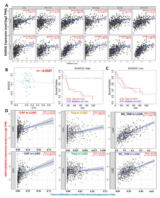 Non-structural protein 3 (NSP3; SH2D3C) promotes dysfunctional T-cell phenotypes in lung cancer patients. (A) Scatterplot showing correlations between NSP3 (SH2D3C) expression and infiltration of various immune cells in lung adenocarcinoma (LUAD) and lung squamous cell carcinoma (LUSC). (B) Correlation analysis between NSP3 (SH2D3C) expression and cytotoxic T lymphocyte (CTL) levels in lung cancer patients. (C) Kaplan–Meier plot of the overall survival of lung cancer patients with different NSP3 (SH2D3C) and CTL levels. (D) Boxplot showing NSP3 (SH2D3C) expression correlations with infiltration levels of immunosuppressive cells, including cancer-associated fibroblasts (CAFs), M2 macrophages, and regulatory T cells in LUAD patients.