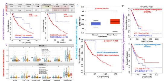 We evaluated the effect of CNA and methylation of NSP3 (SH2D3C) in lung cancer (Figure 5A–F), and the results revealed that NSP3 (SH2D3C) is hypermethylated in tumors of lung cancer patients compared to the normal tissue (Figure 5D). In addition, lung cancer patients with high methylation levels of NSP3 (SH2D3C) exhibited shorter survival duration than cohorts with low methylation levels (Figure 5E). Analysis of CTL level and methylation status of NSP3 (SH2D3C) revealed that cohorts with high levels of NSP3 (SH2D3C) exhibited dysfunctional T-cell phenotypes and poor prognosis (Figure 5F). Nevertheless, we found that the CNA of NSP3 (SH2D3C) are a risk factor for LUAD and LUSC cohorts (Figure 5A). Analysis of the patients’ survival revealed that both LUAD and LUSC patients with CNA of NSP3 (SH2D3C) exhibited shorter overall survival duration than the cohort with low CNA (Figure 5B). In addition, we found that SCNA of NSP3 (SH2D3C) including deep deletion, arm-level deletion, arm-level gain, and high amplification also mediated the infiltrations of the tumor-immune cells in both LUAD and LUSC (Figure 5C). Collectively, these findings prove that hyper-methylation and copy number alterations of NSP3 (SH2D3C) are associated with infiltration of immune cells and poorer prognosis of lung cancer cohorts.