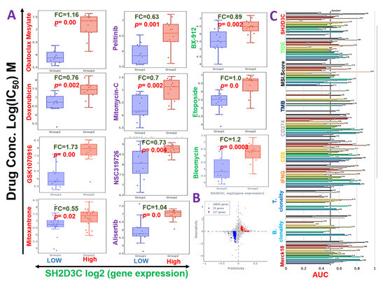 We evaluated the cross-correlation between the expression levels of SH2D3C and the sensitivity of NSCLC cell lines to various clinical drugs. Our results revealed that high expression level of SH2D3C is associated with the resistance of NSCLC cell lines to doxorubicin, mitoxantrone, GSK1070916, obatoclax mesylate, alisertib, NSC319726, mitomycin-C, bleomycin, etoposide, pelitinib, and BX-912 (Figure 6A). Furthermore, we evaluated the efficacy of SH2D3 knockdown (shSH2D3C) in association with the expression of a number of target genes. Interestingly, we found that higher expression levels of the target genes are associated with the low efficacy of shSH2D3C in NSCLC cell lines (Figure 6B). Analysis of the biomarker relevance revealed a clinical predictive value (AUC > 0.5) of SH2D3C in 12 datasets of immunotherapy cohorts. Interestingly, SH2D3C achieved a higher clinical predictive score in a larger number of datasets when compared with TMB, T-cell clonality, and B-cell clonality with a clinical predictive score in 7, 8, and 8 datasets of immunotherapy cohorts (Figure 6C). Summing up the results obtained so far, our study suggested that SH2D3C is an important player in immune and inflammatory events in the carcinogenesis of NSCLC. It is associated with response to therapy in NSCLC and thus serves as an attractive target for exploration.