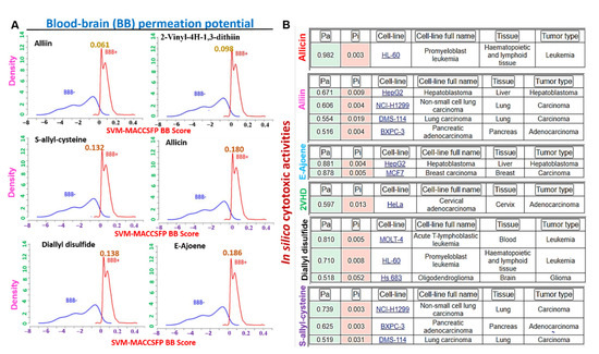 Blood−brain barrier permeation and in silico cytotoxic properties of some organosulfur compounds in garlic. (A) Blood−brain barrier penetration (BBB) permeation curve of some organosulfur compounds in A. sativum. The BBB permeation ability was measured by the support vector machine (SVM) and LiCABEDS algorithms of the BBB prediction server. (B) In silico cytotoxic properties of some organosulfur compounds in garlic against cancer cell lines. Pa = activity, pi = inactivity.