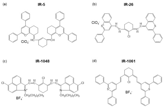 Examples of NIR laser dyes, (a) IR-5, (b) IR-26, (c) IR-1048, and (d) IR-1061.