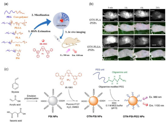 NIR dye-loaded luminescent polymeric micelles and solid nanoparticles. (a) Molecular structures of the compounds used for preparing OTN-polymeric nanoparticles (PNPs) and their schematics (Ex.: excitation; Em.: emission). (b) OTN-NIR fluorescence in vivo imaging of live mouse. OTN-PLA-PNPs (1st and 2nd row) and OTN-PLGA-PNPs (3rd and 4th row) dispersed in PBS were injected intravenously into female BALB/c mice inoculated with colon-26 cells (Scale bar, 10 mm). (c) Schematics of NIR fluorescent dye-loaded polystyrene (PSt) nanoparticles. (a,b) are adapted from reference [57] and (c) from reference [28] with permission with the terms of the Creative Commons CC BY license.
