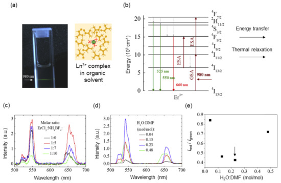 NIR organic laser dyes such as IR-1061 are coordinated with nonpolar anions for reducing nonradiative relaxation, which is heat release upon optical excitation. The coordination of such heavy and large anions to the luminescence center can be applied to the design of Ln3+-based molecular upconversion luminescent phosphors. To date, molecular upconversion fluorophores have been reported on the basis of organic ligands [68,69,70] and metal–organic frameworks (MOFs) [71,72]. The thermal quenching of upconversion luminescence is mostly originated in high-energy OH oscillators, and thus these molecular systems are realized by stabilizing the coordination of compounds in water-free polymeric hosts with high hydrophobicity. Our group has demonstrated an upconversion luminescent complex based on Ln3+ coordinated by tetrahedrons [73], as shown in Figure 3. The complexes were synthesized by the introduction of tetrafluoroborate salts (NH4BF4 and NaBF4) to lanthanide chlorides (ErCl3 and EuCl3) in N,N-dimethylformamide (DMF). The Cl– ligands were replaced by the ligands for Er3+ in the luminescent systems, and they were removed as a precipitate of either NH4Cl or NaCl, which was confirmed by X-ray diffraction analysis. The systematic spectroscopic study revealed that the highest emission intensity, lower red-to-green fluorescence ratio Ired/Igreen (Ired: 630–680 nm; Igreen: 509–576 nm) and narrower emission lines were realized at a mixed molar ratio of Er3+: = 1:7 and in solvents with molar ratio of H2O/DMF = 0.23 (Figure 3c–e). The emission properties of the Er3+ complex suggested that the nonlinear upconversion luminescence was achieved because ligands occupied the first coordination sphere and hampered the thermal quenching. As shown in Figure 3b, a nonradiative decay, which is heat emission, derived from transitions 4S3/2→4F9/2 and 4I11/2→4I13/2 corresponds to an increase in the Ired/Igreen, indicating that the lower Ired/Igreen obtained means more suppression of heat emission (thermal relaxation) in the luminescent system. This decay is described by the multiphonon relaxation rate, WMPR, in Equation (1).