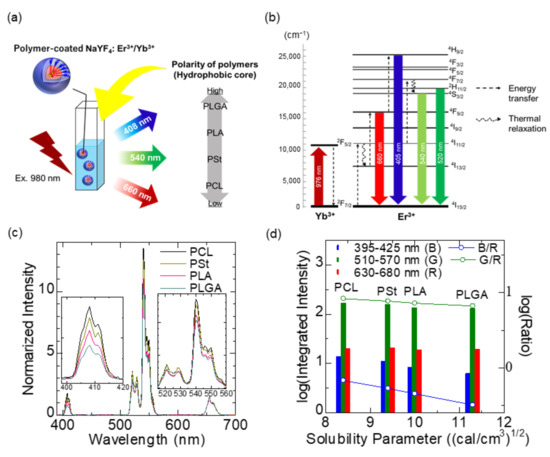 Control over the electric dipole moment of surroundings, such as solvent and anions, around the luminescence center is one of the foremost aspects in the design of Ln3+-based luminescence nanosystems. The influence of surrounding atoms, ions, and molecules on the electronic transition of Ln3+ has an interaction length of >10 nm [76], which is not necessarily a crucial problem in the development of bulk solid-state phosphors. However, for nanoparticles of roughly 1–50 nm in diameter, the thermal emission of the electron system is affected not only by the nanosized crystalline host but also by solvent molecules outside the host nanoparticles. Ln3+-doped inorganic nanocrystals are recognized as stable and efficient phosphors. Sodium yttrium fluoride (NaYF4), for example, is a suitable host lattice for visible and NIR luminescence due to its low phonon energy (~360 cm–1) and for precise size controllability down to single nanometers [77,78,79]. For maintaining the luminescence properties of Ln3+-doped nanocrystals in physiological condition, surface coating by hydrophobic polymers [80] and ceramics shell formation [81] are usually performed, followed by surface modification using biocompatible PEG block copolymer [82]. Both approaches are intended to shield Ln3+ ions from stretching vibrations of surrounding molecules. Simply put, surrounding Ln3+ with either ionic crystals with low phonon energy or molecules with less chemical polarity is the key to the realization of bright illumination from Ln3+-doped nanoparticles. Nevertheless, few studies have been performed to systematically evaluate the effects of surroundings on the luminescence properties of Ln3+-doped nanoparticles, especially by the chemical polarity. We therefore investigated the effects of dispersion solvents and coating polymers on the upconversion luminescence of NaYF4:Yb3+,Er3+ nanoparticles under 980 nm optical excitation [83], as shown in Figure 4a,b. Spectroscopic measurements were performed on the following luminescence systems: (1) NaYF4:Yb3+,Er3+ nanoparticles dispersed in solvents such as dichloromethane, tetrahydrofuran, cyclohexane, and hexane and (2) water dispersion of NaYF4:Yb3+,Er3+ nanoparticles coated with either PCL, PSt, PLA, or PLGA as a hydrophobic part of the PEG block copolymer. Table 2 summarizes the HSPs of solvents and polymers used, as well as of blood components [60,62,63,84,85,86]. Note that the total solubility parameter, δT, of PLGA varies in the range of 10.3–11.3 depending on the ratio of lactide-to-glycolide [62]. The results obtained from the system (1) revealed that the upconversion emission spectra, such as the green and blue emission (540 and 408 nm, respectively) ratios to the red (660 nm), were well correlated with the polarity of the molecules that surround the nanoparticles. In the system (2), the intensity of 408 and 540 nm was highest when the NaYF4:Yb3+,Er3+ nanoparticles were coated by PCL, which has the lowest polarity among the four polymers, whereas the one of 660 nm was highest when the nanoparticles were coated by PLGA having the highest polarity (Figure 4c,d). This is because the thermal relaxation (4I11/2 → 4I13/2) was enhanced with an increase in the polarity, resulting in increased emissions at 660 nm (4F9/2 → 4I15/2) and decreased emissions at 405 nm (4H9/2 → 4I15/2). The results suggested that when polymers and solvents possess a high solubility parameter, the degree of thermal quenching tends to increase.