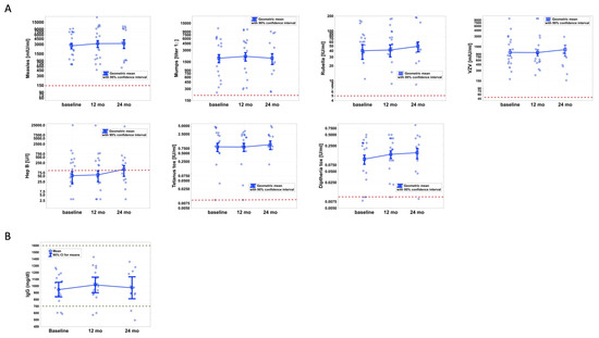Specific IgG antibodies to 7 pathogens were not altered by cladribine (CLAD) treatment at 12 and 24 months (mo) (A). Absolute IgG blood levels remained stable despite immune reconstitution by CLAD (B). No significant reductions were found. CLAD tablets were administered at baseline and months 1, 12 and 13 according to the manufacturer’s recommendations. Red dotted lines indicate the cut-offs for antibody titers. Black dotted lines represent the normal range.