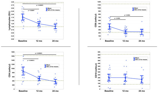 Expectedly, absolute numbers of CD4 + Th and CD8 + cT cells were significantly decreased at 12 months (p < 0.000012 and p < 0.0002) and 24 months (p < 0.000001 and p = 0.0004), whereas CD19+ B cell numbers were not significantly altered at T1 or T2 compared to baseline.