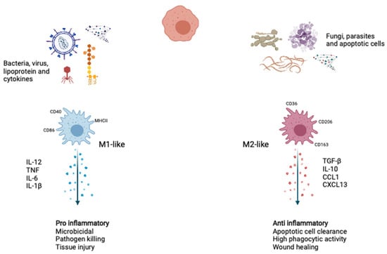Macrophages are the body’s first line of defense against pathogens and play a crucial role in innate immunity and have varying maturity and growth potentials and extensively exist as cells with specialized features in various tissues [1,2,3]. Under homeostatic conditions, macrophages adopt phenotypes associated with tissue repair and wound healing. During the acute microbial infection, more myeloid cells are required to replenish consumed innate immune cells. Emergency myelopoiesis increases in the number of myeloid progenitors upon danger signals and inflammatory cytokines. When macrophages encounter pathogens, they express reactive nitrogen and oxygen species and proinflammatory cytokines to aid their antimicrobial and immune-activation functions necessary to kill pathogens. In response to various environmental stimuli and molecular mediators, monocytes differentiate into two representative phenotypes: proinflammatory M1-like macrophages and anti-inflammatory M2-like macrophages (Figure 1).