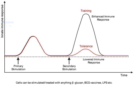 Based on these criteria, the dual features of innate immune memory can be defined as training or tolerance [14] (Figure 2). In trained immunity, epigenetic and metabolic reprogramming occur during the activation of immune cells by stimulation [12,14]. As these modifications are maintained, responsiveness to secondary stimulation is enhanced and higher than the primary response [12,14]. Trained macrophages show persistent changes in gene expression and cellular physiology without constant genetic changes like mutation [15]. Environmental stimuli such as LPS, β-glucan, and Bacillus Calmette–Guérin (BCG) can induce trained immunity [13,16]. Trained innate immune cells affect crucial cellular processes like homeostasis and inflammatory responses [17,18].