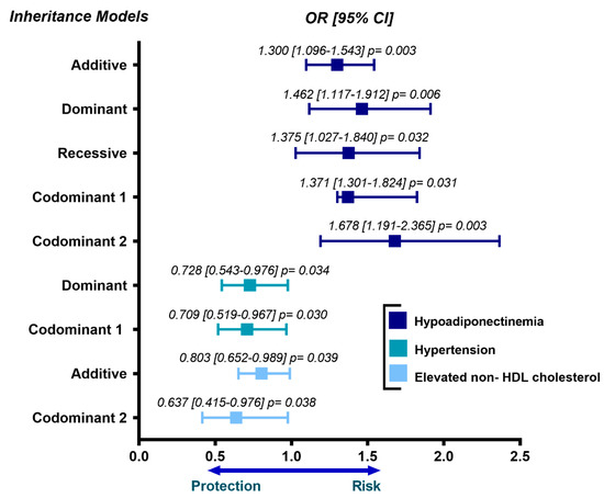 The association of OPN gene polymorphisms with cardiovascular risk factors and metabolic parameters was assessed separately in patients with pCAD and controls. In patients with pCAD and under different inheritance models, we observed that rs11730582 was associated with an increased risk of hypoadiponectinemia (OR = 1.300, 95% CI = 1.096–1.543, P additive = 0.003; OR = 1.462, 95% CI = 1.117–1.912, P dominant = 0.006; OR = 1.375, 95% CI = 1.027–1.840, P recessive = 0.032; OR = 1.371, 95% CI = 1.301–1.824, P codominant 1 = 0.031; OR = 1.678, 95% CI = 1.191–2.365, P codominant 2 = 0.003), with a decreased risk of hypertension (OR = 0.728, 95% CI = 0.543–0.976, P dominant = 0.034; OR = 0.709, 95% CI = 0.519–0.967, P codominant 1 = 0.030), and low risk of having increased levels of non- HDL cholesterol (OR = 0.803, 95% CI = 0.652–0.989, P additive = 0.039; OR = 0.637, 95% CI = 0.415–0.976, P codominant 2 = 0.038). These outcomes are depicted in Figure 1.