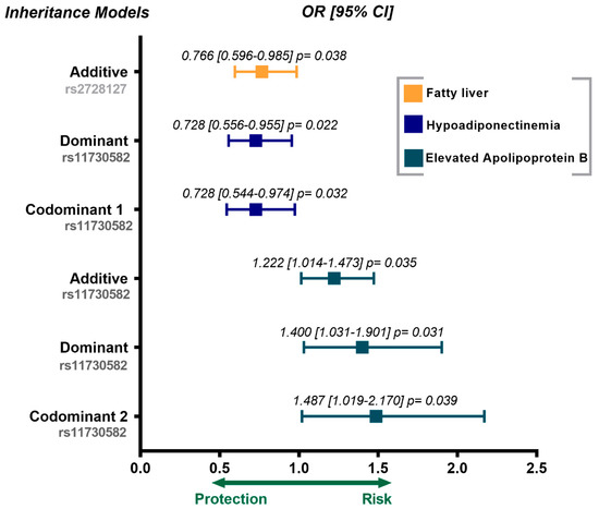 In the control group, the rs2728127 polymorphism was associated with a low risk of fatty liver (OR = 0.766, 95% CI = 0.596–0.985, P additive = 0.038). The rs11730582 polymorphism was associated with a lower risk of hypoadiponectinemia (OR = 0.728, 95% CI = 0.556–9.555, P dominant = 0.022; OR = 0.728, 95% CI = 0.544–0.974, P codominant 1 = 0.032), and high risk of having increased apolipoprotein B levels (OR = 1.222, 95% CI = 1.014–1.473, P additive = 0.035; OR = 1.400, 95% CI = 1.031–1.901, P dominant = 0.031; OR = 1.487, 95% CI = 1.019–2.170, P codominant 2 = 0.039). These results are shown in Figure 2. All genetic models were adjusted for age, sex, and body mass index.