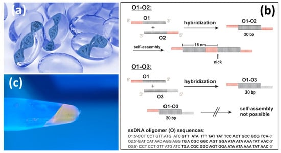 In Figure 1b,c, a schematic and a photograph show a three-dimensional DNA hydrogel that was made by self-assembly of short linear double-stranded DNA building blocks furnished with sticky ends. The resulting DNA hydrogel was thermo-responsive, and the length of the supramolecular double-stranded DNA structures varied with temperature [6]. Proper selection of oligomer pairs is critical to ensure the formation of hydrogels; for instance, pairing O1 and O3 oligomers does not result in self-assembly and gelation (Figure 1b). A recent review [7] studied the existing data and methods related to the mechanical design of pristine DNA and hybrid hydrogels and their use in cell culture. The focus of the article was to advance further studies toward designing multifunctional DNA hydrogels with programmable and controlled mechanical properties.