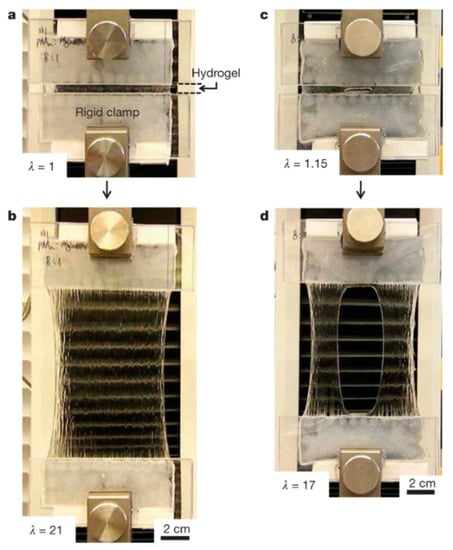 The flexibility and stretching and elastic recovery of hydrogels are very important sought-after properties, as shown in Figure 2, because poor mechanical stability of hydrogels used for cell encapsulation can cause involuntary cell release and death [9], and low toughness severely restricts the durability of contact lenses [10]. In Figure 2, a highly stretchable, tough hydrogel is demonstrated by mixing two types of cross-linked polymers, namely, ionic cross-linking of alginates and covalently cross-linked polyacrylamide [8].