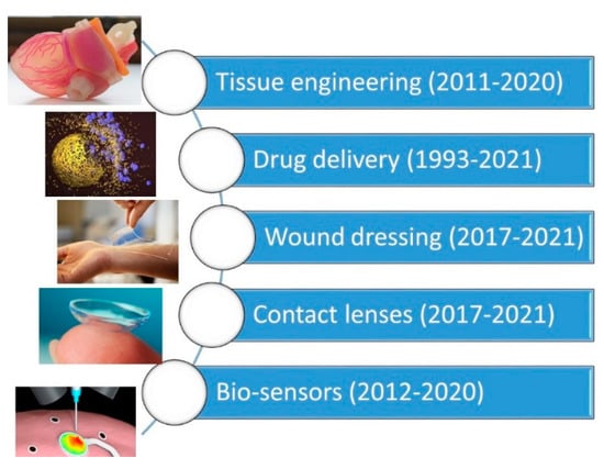Number of reviews and publication periods on different hydrogel applications in biomedical field.