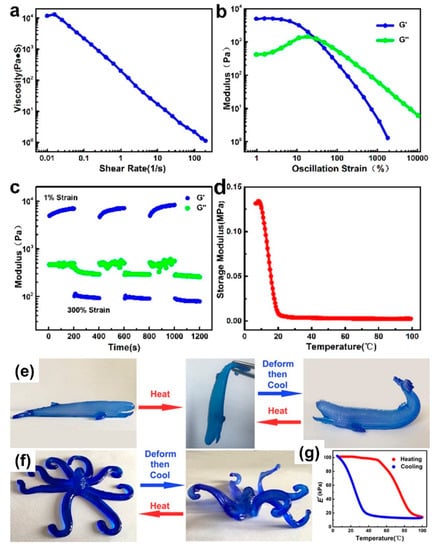 Rheological behaviors of the agarose/AM/Laponite 4D ink at 95 °C. Flow rheology pattern showing viscosity against shear rate (a). Oscillatory rheology pattern showing shear storage modulus (G′) and shear loss modulus (G″) evolution of inks used, increasing shear strain (b). Oscillatory rheology pattern showing modulus evolution of inks between 1% and 300% strain (c). The storage modulus variation of 4D ink during cooling (d). Four-dimensional printing product printed by 4D ink: a whale-like hydrogel was used as a model schematic for the 4D transition process (e), the softening and hardening cycles of an octopus-like gel (f), the storage modulus (e) variation of 4D gel during heating and cooling cycles measured by rheology (g). Reproduced from [152] with permission.