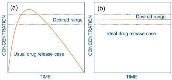 In order to have an efficient therapeutic effect, a drug should have high affinity and selectivity for the intended biological function. For instance, pure proteins or protein complexes should target certain cells, penetrate the membrane, and reach a sufficient concentration at that specific site. To achieve this, the drug needs to be released from the delivery system, transported from the site of application to the site of action, take part in biological reactions, and finally be eliminated via metabolic pathways. It is now generally accepted that rapidly released drugs, whether taken orally or administered in other ways, result in peaks and valleys in drug levels (Figure 9a), which may cause inefficient drug administration and, possibly, undesirable side effects [169]. Sustained drug delivery technology signifies one of the most rapidly evolving areas in human health care. These delivery systems (Figure 9b) have numerous advantages compared to conventional dosage forms, including better efficacy, reduced toxicity, and improved patient compliance and convenience. Controlled release often requires synthetic polymers as carriers for the drugs some of which were cited in [170]. A comprehensive study of drug release from hydrogels in general was conducted by Lee and Kim [171] in 1991. Therein, they conducted detailed studies on the sustained release of both hydrophilic and lipophilic model drugs. An earlier study by Lee [172] presented a detailed analysis of water-soluble drugs from initially dehydrated hydrogel matrices that generally involved the simultaneous absorption of water and desorption of drug via a swelling-controlled diffusion mechanism. The author developed a method to model constant-rate drug delivery from glassy hydrogel matrices via an immobilized non-uniform drug concentration distribution.