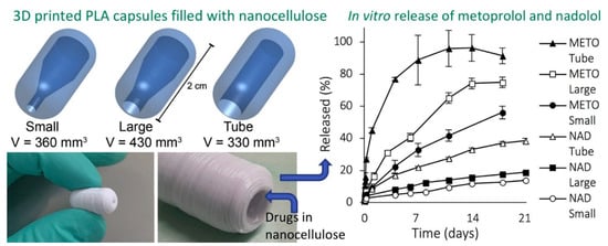 A notable work was recently conducted by modulating sustained drug release from nanocellulose hydrogels by adjusting the inner geometry of implantable capsules [202]. The authors 3D printed capsules using PLA and inserted drug-loaded nanocellulose hydrogels inside them, so that the PLA would sustain the release from the nanofiber hydrogel as shown in Figure 10.