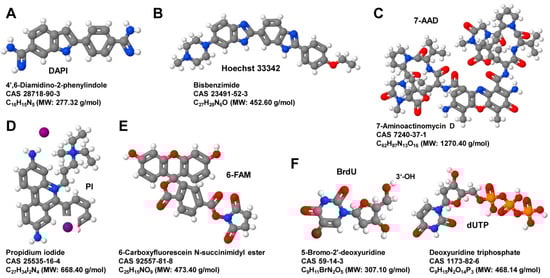 Selection of substances frequently used in FACS analysis. (A) 4′,6-dDiamidino-2-phenylindole (DAPI) is a cell-permeable compound that binds strongly to adenine–thymine-rich regions in DNA. The DAPI-DNA complex has an absorption maximum at a wavelength of 358 nm (ultraviolet) and an emission maximum at 461 nm (blue) that can be detected through a blue/cyan filter. (B) Unbound Hoechst 33,342 has a maximum fluorescence emission at 510–540 nm, while this dye emits in ultraviolet light (~350 nm) blue fluorescence with an emission spectrum maximum at 461 nm when bound to double-stranded DNA. (C) The fluorescent dye 7-Aminoactinomycin D intercalates primarily in double-stranded DNA with high GC-content. If used for cell staining in FACS, the cell membrane must be permeabilized. It can be best excited with diode lasers at 561 nm resulting in an emission with a maximum of 647 nm. (D) Propidium iodide is a not membrane-permeable fluorescent DNA intercalating agent with an excitations maximum of 493 nmg (blue-green), and an emission maximum of 636 nm (red). (E) 6-Carboxyfluorescein N-succinimidyl ester is a cell-permeable, amine-reactive fluorescent dye that particularly binds via its succinimidyl group to proteins rich in lysine with an absorption wavelength of 495 nm and an emission wavelength of 517 nm. (F) 5-Bromo-2′-deoxyuridine (left) is a nucleotide analog to dUTP (right) that can incorporate in place of thymidine in newly synthesized DNA. The modified DNA can be detected with BrdU-specific antibodies or directly visualized when labeled with flurochormes at its 3′-OH position. All images were generated with the open-source Java viewer Jmol version 14.2.15_2015.07.09 [19].