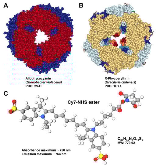 Examples of pigments with fluorescent properties. (A) Allophycocyanin (APC) is an accessory, water-soluble pigment of red or blue-green algae that has an absorption maximum at 652 nm and an emission maximum at 657.5 nm. It is composed of a trimer with an (αβ)3 structure and a molecular weight of 105,000 Daltons. The structure of the Allophycocyanin from Gloeobacter violaceus depicted was taken from the RCSB Protein Data Bank (PDB, access. no.: 2VJT) (B) Phycoerythrin (PE) is a red protein-pigment occurring in red algae and cryptophytes. It is composed of αβ monomers that can form either trimers (αβ)3 or hexamers (αβ)6. Depicted is the crystal structure of the light-harvesting R-Phycoerythrin from the red algae Gracilaria chilensis deposited in the PDB (access. no. 1EYX). The structures shown in (A,B) were created with the NGL WebGl-based molecular viewer [24]. (C) Structure of the cyanine 7-N-hydroxysuccinimide (Cy7-NHS) ester that is a near-infrared fluorescent dye specifically designed for labeling of amines.