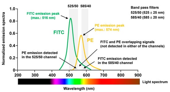 Fluorescence compensation. The fluorescence emission spectra for Fluorescein isothiocyanate (FITC) and Phycoerythrin (PE) partially overlap when detected with the commonly used filters 525/50 (allows to pass wavelengths with an entire band’s width of 525 ± 25 nm) and 585/40 (allows to pass wavelengths with an entire band’s width of 585 ± 20 nm). When FITC or PE should be properly quantified using so-called ‘compensation controls’, which are single stained samples for each used fluorochrome within the respective panel, the signals that result from the other fluorochrome in the respective channel of the band pass filters used for measurement must be subtracted. FITC and PE overlapping signals that are not detected in either of the channels can be ignored [25].