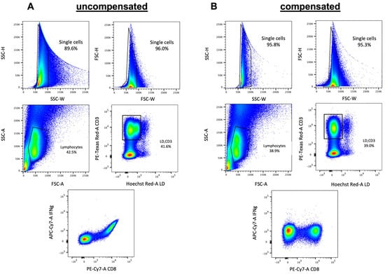 Analytical pitfalls in FACS analysis. When working with a 15–20 color panel, compensation is of utmost importance. (A) shows the gating of a human peripheral blood mononuclear cells (PBMCs) sample before compensation. (B) displays the same file after automatically applying the compensation in FlowJo, a software application that has an integrated environment for viewing and analyzing flow cytometric data [26]. Due to the nature of flow cytometry, the emission of a specific dye in a mixture of dyes is usually measured not only in a single detector but in all detectors being used in the specific experiment. During compensation, the signals of any other fluorochrome are removed except the one devoted to measuring that dye by calculating and subtracting the spillover values of them. Therefore, for each fluorochrome used in the experiment, a single-stained sample must be analyzed in parallel. Although the need for compensation can be avoided by using fluorophores that do not have overlapping emission spectra or combining fluorophores that can be uniquely activated by specific laser lines, compensation will be usually necessary when using panels with a large number of different fluorochromes.