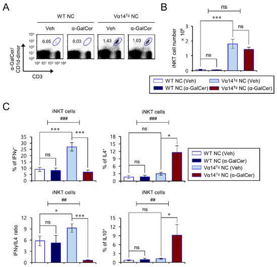 Repeated in vivo α-GalCer treatment changes the iNKT cell phenotype of Vα14Tg NC mice towards type 2 cytokine production. (A–C) Spleens were prepared from mice as shown in Figure 1. (A,B) The frequency and cell number of splenic iNKT cells (α-GalCer/CD1d-dimer+CD3+) were determined by flow cytometry. (C) Intracellular IFNγ, IL4, and IL10 were analyzed in splenic iNKT cells (α-GalCer/CD1d-dimer+CD3+). The mean values ± SD (n = 4 in (A–C); per group in the experiment; Student’s t-test; * p < 0.05 and *** p < 0.001) are shown. Two-way ANOVA (Vα14 TCR Tg × α-GalCer) showed an interaction between these two factors. One representative experiment out of two experiments is shown (## p < 0.01 and ### p < 0.001).