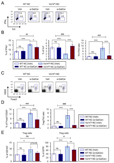 Treg cells play essential roles in regulating immune responses. When Treg cells become dysregulated, pathogenic Th2 cells and serum IgE levels are drastically elevated in allergic diseases such as AD. In particular, a Treg/Th2 imbalance highly correlates with the severity of AD pathogenesis [1,28,29]. Thus, we wondered whether repeated α-GalCer activation might affect the generation of Treg cells in Vα14Tg and littermate WT NC mice during AD development. To address this issue, we measured the frequency of Treg cells in the spleen after repeated α-GalCer treatment. We found that splenic Treg cells in Veh-injected Vα14Tg NC mice were approximately 200% higher than in Veh-injected WT NC mice. However, repeated α-GalCer-injection into Vα14Tg NC mice statistically decreased the prevalence of splenic Treg cells by 40% compared with Veh-injected Vα14Tg NC mice, indicating that the ratio of Treg cells to Th2 cells was markedly reduced in α-GalCer-injected Vα14Tg NC mice (Figure 3C,D). We next examined the effect of repeated α-GalCer treatment on Treg-associated molecules (CD103 and GITR) of the splenic Treg populations in Vα14Tg NC mice. Alpha-GalCer injection resulted in a modest decrease in CD103 expression but a significant decline in GITR expression among splenic Treg cells in Vα14Tg NC mice (Figure 3E), which implies that repeated α-GalCer injection may downregulate Treg cell function as well as its frequency. However, in WT NC mice, neither Treg cell number nor Treg-associated molecule expression were significantly affected by α-GalCer injection. These findings collectively suggest that α-GalCer-stimulated iNKT cells downregulate Treg cells quantitatively and qualitatively in Vα14Tg NC mice, which likely contributes to the spontaneous development of AD.