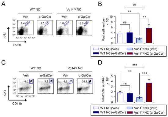 An increase in mast cells and their capacity to be activated by IgE antibodies contributes to the pathogenesis of AD [1]. In addition, neutrophil accumulation is essential for turning skin inflammation into a chronic condition [30]. Moreover, mast cell-derived histamine and neutrophil-derived CXCL10 stimulate histamine receptors and chemokine receptor CXCR3, respectively, on sensory neurons to drive itch in AD skin lesions [31,32]. Thus, we explored whether repeated α-GalCer injection induces phenotypic changes in splenic mast cells and neutrophils in Vα14Tg NC mice during spontaneous AD progression. We found that α-GalCer treatment induces a significant increase in mast cells and neutrophils in Vα14Tg NC mice (Figure 4A–D). Furthermore, consistent with our previous report, Vα14Tg NC mice displayed substantially lower splenic mast cells and neutrophils than WT littermate NC mice (Figure 4A–D).