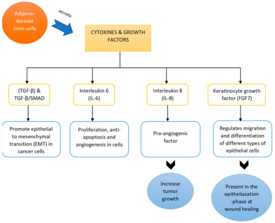 The ability of ADSCs to promote tumors is mainly due to their active release of factors. In the study of Preisner et al., (2018), the team co-cultured a lower passage of primary melanoma cells and ADSCs to determine the effect of ADSCs in promoting tumors [29]. The main reason for the use of lower-passage primary melanoma cells instead of other passages is because they closely resemble cancer cells In vivo. The results obtained from this study showed an increment in HGF in melanoma cells after they were co-cultured together with ADSCs [29]. These findings showed that HGF plays an important role in affecting the growth of melanoma cells. HGF is a multifunctional cytokine that can activate various downstream pathways involved in angiogenesis, tumor growth, migration, and metastasis. Moreover, HGF has been shown to activate melanoma proliferation through MAPK signaling. This latter effect could, at least in part, be responsible for the increased proliferation of low-passage primary melanoma cell cultures. Furthermore, other regulating factors have also been detected, such as interleukin-6 (IL-6), which is responsible for proliferation, anti-apoptosis, and angiogenesis in cells [29].