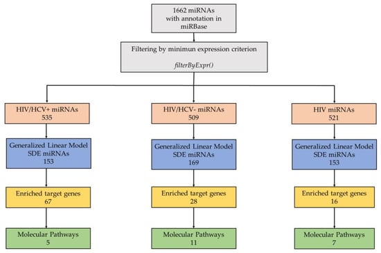 Despite hepatocytes being the target cells for HCV infection, peripheral blood mononuclear cells (PBMCs) constitute its main extrahepatic reservoir, being able to co-exist with HIV in coinfection. PBMCs miRNA profile changes provide us information on innate and adaptive immune responses against HIV and HCV infections or even viral hijacking. For instance, the hsa-miR-122-5p, a liver-specific miRNA that modulates the liver homeostasis and its HCV hijacking to favor the HCV viral cycle [12], while the hsa-miR-223 promotes HIV latency in CD4+ T cells of HIV-1 patients by binding to the viral 3′ UTR [13]. Many questions remain unanswered in miRNA profile characterization, especially in the context of HIV/HCV coinfection, where scarce data have been published and none with a massive approach, which may be an additional key to elucidate virus-host relationships and their consequences.