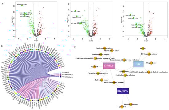 Analysis of differentially expressed miRNAs in HIV patients relative to healthy controls, potential target genes and molecular routes. (A) Volcano plots of SDE miRNAs in PBMCs of HIV/HCV+ (left), HIV/HCV- (middle) and HIV (right) patients compared to healthy controls. The expression level change (log2FC) and significance (−log10FDR) have been positioned on the x-axis and y-axis, respectively. The colored dots represent significantly differentially expressed miRNAs, indicating upregulation in green and downregulation in red. Those SDE miRNAs with strong up/downregulation (Log2FC > 2 or Log2FC < −2) are highlighted in wider triangle-shapes and labelled. (B) Chord diagram showing the enriched target genes for the SDE miRNAs in the HIV-infected groups (HIV/HCV+ in purple, HIV/HCV- in pink and HIV in blue). (C) Network map associating the enriched gene targets and their most significant biological process (KEGG pathways).