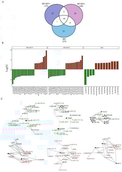Analysis of specific viral infection signature due to HIV/HCV+, HIV/HCV- or HIV infection: (A) Venn diagram representing the distribution of shared and non-shared significant differentially expressed SDE miRNAs among each HIV group (colorless and colored areas, respectively). (B) Bar plot of the fold change of non-shared SDE miRNAs (x-axis) in the log 2 scale (y-axis). Downregulated and upregulated miRNAs are presented as green and red bars, respectively. (C) Network graph of the top 10 target genes (black nodes) and their SDE miRNA interactor partners (green/red nodes) for each analysis. Down or upregulated miRNAs in HIV patients have been colored in green and red, respectively. The thicker the line connecting SDE miRNAs to their target gene the more significant the interaction, and the wider the radius the greater number of interactions for each target gene.