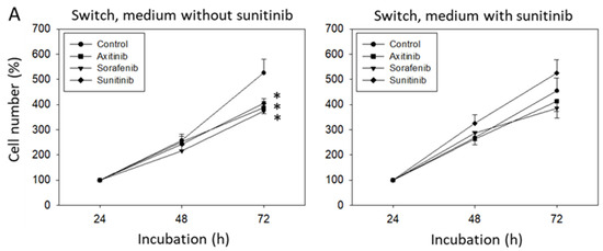 Following six weeks sunitinib or medium (control) exposure, sorafenib or axitinib treatment was initiated. Controls displayed diminished HUVEC growth, independent from the TKI used, whereas no effect on cell growth was seen when HUVEC had been pretreated with sunitinib for six weeks and then subjected to either sorafenib, axitinib or sunitinib for 24 h (Figure 3A).