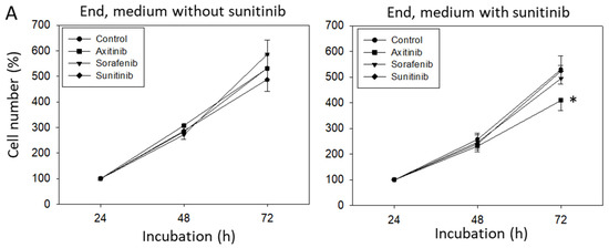 This study was designed to investigate how two second line TKIs, axitinib and sorafenib, affect endothelial cell growth and angiogenic behavior following first line TKI failure with sunitinib. The clinical relevance is not only restricted to treatment where first-line therapy is based exclusively on a TKI, since combining TKIs with immune ICIs has been approved as a new first-line option to treat RCC. However, systematic reviews and meta-analyses have shown that the majority of patients are unlikely to benefit from ICIs [9], and resistance develops whether the patients have been treated with a TKI monotherapy or a TKI-ICI combination [10]. TKIs have therefore also been suggested as second-line therapy for RCC patients, refractory to ICIs [7,10]. The EAU, ESMO and NCCN recommend any TKI, including axitinib and sorafenib, that has not been used first line [10], as do others [11]. Accordingly, Deuker et al. has not seen major differences in the efficacy of several TKIs after an immunotherapy-based combination regimen [12]. Overall survival of patients treated with axitinib or sorafenib, subsequent to discontinuing an ICI-TKI regimen or sunitinib therapy, was similar [13,14]. In contrast, others have attested to better results with axitinib, instead of sorafenib, as a second line option [7,15]. Both Schmidinger et al. and Géczi et al. have recommended second-line axitinib post sunitinib [16,17], whereas sorafenib as a second-line treatment (following sunitinib failure) has been favored by other investigators [18].