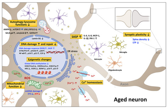 Cells are the basic building blocks of all multicellular organisms. Cellular senescence is thought to contribute to brain aging and age-related neurodegenerative diseases through a variety of mechanisms [10,11]. Nevertheless, there are common signaling pathways and hallmarks [12,13,14]; these include the DNA damage response, chromatin alterations, mitochondria impairment, lysosome impairment, autophagy disruption, SASP (senescence associated secretory phenotype) changes, and decreased synaptic plasticity—all of which can be recognized in senescent neurons (Figure 1). Each of these domains is activated during aging, and all appear to interact with each other. Cell senescence has been identified as an important driver of mammalian brain aging [15,16,17].