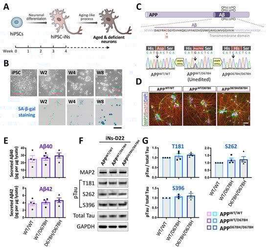 In fact, iPSC-based disease models derived from patients with neurodegenerative disorders typically exhibited no disease-associated phenotypes under normal culture conditions [213,214,302]. Our group also demonstrated that hiPSC-iNs derived from an AD patient with the APP_D678H mutation show no significant changes in neuronal morphology, gene expression levels, and AD pathological characteristics, such as Aβ accumulation and Tau protein hyperphosphorylation, during differentiation and early maturation, even compared to its isogenic controls (Figure 2C–G). These observations suggest that patient iPSCs can successfully differentiate into mature iNs under normal conditions, and may only mimic the phenotypic features at the pre-clinical stage of a disease or perhaps at an early stage of a disease. As aging is the primary risk factor for AD, the patient iPSC-iNs might recapitulate AD-like pathologies only when they are switched to an aged status.
