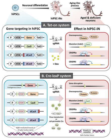 Protein overexpression and gene knockdown or knockout are key technologies when studying molecular mechanisms in neuroscience research. However, conventional genetic manipulation methods are inadequate when studying senescence processes in mature neurons as they may cause early lethality at the hiPSC or neural progenitor stage. It has been suggested that fine-tuning the expression of some lethality-causing genes or essential genes in differentiated (and aged) neurons is necessary in order to be able to analyze their functions. Nevertheless, post-mitotic neurons are generally difficult to culture and are particularly resistant to the delivery and expression of recombinant genes, thereby often limiting experimental approaches. To address this issue, an inducible approach that will allow the genetic manipulation of mature neurons would be highly desirable in order to facilitate research on the molecular basis of neuronal function, especially the aging process (Figure 3). The available tools, namely inducible systems such as Tet-on and Cre-loxP, have been used extensively for gene regulation using in in vitro and in vivo models [319]. Briefly, the inducible functional cassette is knocked into a genomic safe harbor (e.g., AAVS1) in hiPSCs via CRISPR/Cas9-mediated HDR. After neuronal differentiation, temporal control of gene expression or gene inactivation in the mature hiPSC-iNs is achieved by the addition of either doxycycline (Dox) or Cre protein, respectively. Recently, Ding and colleague reported that they were able to generate a human gene-editable iPSC line that could be used to efficiently introduce specific mutations through the addition of designed sgRNAs, and these modified cells could then be induced to differentiate into disease-modeling cells [320]. The inducible system using CRISPR technology, combined with the hiPSC-iN approach, is becoming a valuable tool for the study of molecular mechanisms during neuronal senescence, as well as being useful for drug discovery.