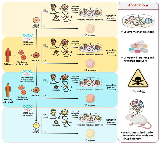 Accompanied by the development of hiPSC-derived neuronal models, gene editing technologies have significantly improved our understanding of age-associated neuronal senescence, as well as of neurodegenerative disorders. The use of hiPSCs from patients to generate disease models has provided an invaluable tool for studying the early pathogenic mechanisms acting in neurological disorders that have monogenic variant/mutation. In order to compare phenotypic effects robustly in vitro, an isogenic line, in which the known gene mutation is corrected by the CRISPR/Cas9 method, is necessary in order to ensure that the observed differences are attributable to a specific genetic defect. For example, we generated hiPSC lines from AD patients that carry the APP mutation as well as gene-corrected isogenic clones, and then used these to assess the therapeutic potential of a Chinese herbal medicine [302]. Moreover, CRISPR/Cas9 was also utilized to create mutations in iPSC lines from healthy control subjects. This was particularly helpful when exploring rare diseases where there is reduced accessibility to patient-derived samples that allow for the generation of patient-derived iPSCs, or when there is difficulty in obtaining patient samples with a specific genotype. The genome editing of isogenic lines also allowed the study of many variants with the same genetic background at once, which can be more practical than gathering a large number of patient and control lines.