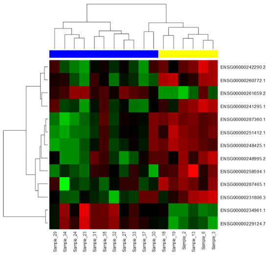 Hierarchical clustering and heatmap visualizing 13 lncRNAs differentially expressed between six multiple myeloma (MM) samples (yellow) and eleven plasma cell leukemia (PCL) samples (blue) (p ≤ 0.00025) in the exploration phase of the study. Red represents high expression levels, and green represents low expression levels.