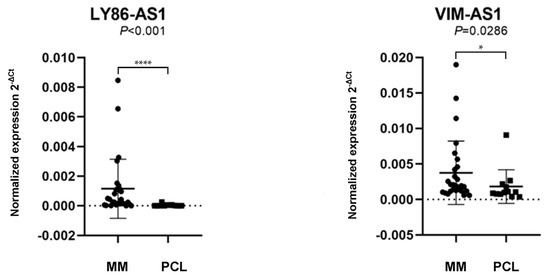 Comparison of the expression levels of lncRNA lymphocyte antigen antisense RNA 1 (LY86-AS1) and VIM antisense RNA 1 (VIM-AS1) in patients with multiple myeloma (MM) and plasma cell leukemia (PCL). The lncRNAs levels in a validation cohort of patient samples, with the data presentation as the median value of the normalized lncRNA expression and interquartile range (25,75) with the standard deviation. The values were compared using the Mann–Whitney U-test. The expression levels were defined as the 2−ΔCt values normalized to the PPIA expression levels.* p < 0.05, **** p < 0.0001.