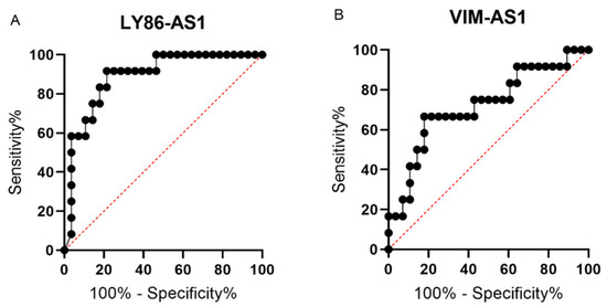 Receiver operating characteristic (ROC) curves for lncRNAs LY86-AS1 (A) and VIM-AS1 (B) that were found to be significantly deregulated in bone marrow plasma cells (BMPCs) of multiple myeloma (MM) and plasma cell leukemia (PCL) patients in the validation phase of the study.