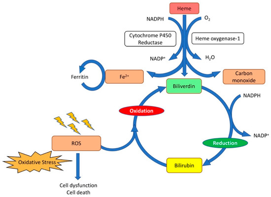 Another enzyme with an antioxidative potential is heme oxygenase-1. This enzyme is an inducible stress response protein that exerts pleiotropic cytoprotective effects, including reduction of oxidative stress [45,46,47], inflammation [48], and apoptosis [49]. Heme can be derived either from intracellular sources, such as hemoproteins and mitochondria, or from extracellular sources, namely damaged tissues, and red blood cell hemolysis. Heme oxygenase-1 converts heme to biliverdin [50]. This reaction also generates carbon monoxide (CO) and induces the release of iron, which is stored within the iron-binding protein ferritin [45,51]. Biliverdin is subsequently reduced to bilirubin by biliverdin reductase (Figure 2). Bilirubin can scavenge ROS and is reconverted to biliverdin [50].