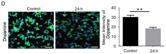 Neurons rely on signal transmission for cell-to-cell communication in a neuronal network. The mitochondrial membrane potential plays an important role in maintaining signal transduction in neurons. Herein, we investigated the effect of mechanical stress on neurons to establish an injured neuronal cell model. The neurons aligned perpendicularly to the stretching direction (Figure 1A). Furthermore, the MMP was altered after 6 h of cyclical stretching at 25% and 1 Hz uniaxial deformation, as shown by JC-1 staining. In turn, this alteration substantially increased the ratios of green/red fluorescence compared to those of the control. Thus, stretching triggers MMP collapse by depolarization (Figure 1B). TBI-induced oxidative stress in the brain can lead to neurodegenerative diseases as well. Oxidative stress is a major mediator of the secondary injury that follows TBI [29]. Neuronal death, a hallmark of TBI, where the loss of dopaminergic neurons and dopaminergic dysfunction is observed. Levels of dopamine (DA) were shown to be decreased 24 h after injury in an experimental mouse model of TBI [30]. Therefore, we determined to study if mechanical stress reduces levels of DA and oxidative DNA damage. Following stretching at 25% and 1 Hz for 24 h, the 8-OHdG immunoreactivity had substantially increased compared to the control (Figure 1C), and the levels of DA had substantially decreased compared to the control (Figure 1D). Hence, stretching-mediated mechanical injury altered the mitochondrial membrane potential and increased oxidative DNA damage.