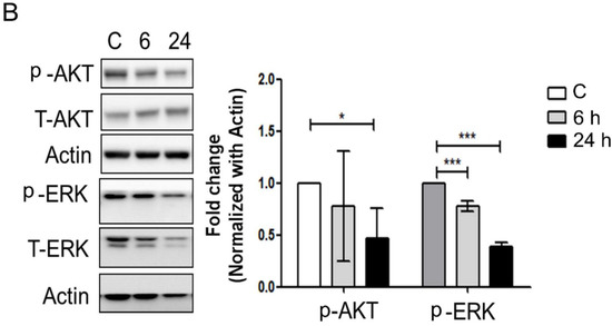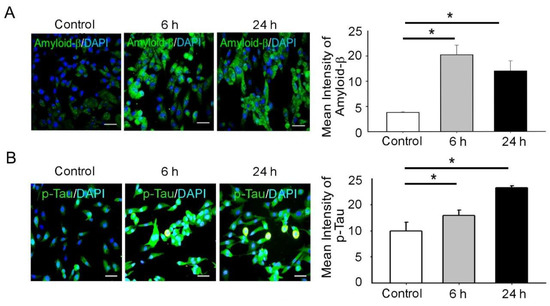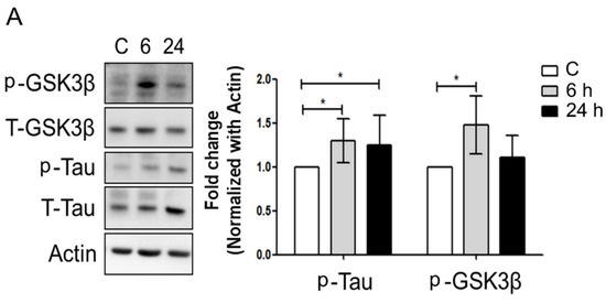 Insulin/IGF resistance in AD brain results in decreased phosphoinositol-3-kinase (PI3K)/Akt [23,24] and increased activation of glycogen synthase kinase 3β (GSK-3β). Furthermore, injured neurons accumulate phosphorylated Tau and GSK3β. Thus, we aimed to determine if AKT/extracellular-signal-regulated kinase (ERK) signaling pathway defects upregulated amyloid-β/p-TauS396. Both p-TauS396 and p-GSK3βS9 protein levels were significantly upregulated, 6 h following the mechanical stretching (Figure 3A). p-AKT/p-ERK, the proteins were significantly downregulated following 6 and 24 h of mechanical stretching (Figure 3B). Thus, mechanical stretching downregulates the p-AKT/p-ERK and upregulates p-GSK3β/p-Tau protein levels, which results in neuronal injury.