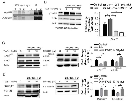 Mechanical injury promotes p-Tau-pGSK3β complex formation and affects the insulin pathway. (A) Co-immunoprecipitation was performed to study the p-TauS396 and anti-GSK-3βS9 protein complex formation. The input protein comprises 10% of the total lysates, and the remaining 90% protein lysate was incubated with the p-TauS396 or anti-GSK-3βS9 primary antibody. Co-immunoprecipitation was performed to study the p-Tau and p-GSK3β protein complex formation. The input protein comprises 10% of the total lysates, and the remaining 90% protein lysate was incubated with the p-GSK3β primary antibody. (B) We analyzed the function of p-GSK3β by adding the p-GSK3β inhibitor and TWS119 while the cells were being stretched. p-Taus396 protein levels significantly decreased in the 25%, 1 Hz-TWS119 group. (C,D) We conducted Western blot to analyze phosphorylated p-AktS473, p-ERKT202/Y204, p-GSK-3βS9, and T-β-catenin protein in SH-SY5Y cells, before and after the stretching or TWS119 administration. The immunoblot demonstrates greater levels of p-AktS473, p-ERKT202/Y204, p-GSK-3βS9, and T-β-cateninin SH-SY5Y cells, before and after the stretching or TWS119 administration. ** p < 0.01; * p < 0.05. GSK3β, glycogen synthase kinase 3; ERK, extracellular-signal-regulated kinase.