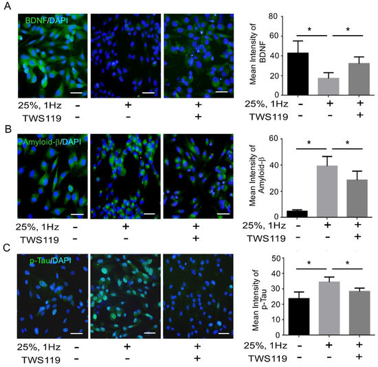 P-GSK3β reduces BDNF levels and upregulates amyloid β/p-Tau expression in the neuron injury model. (A–C) Representative green fluorescence images of BDNF, amyloid β, and p-TauS396 positive cells in SH-SY5Y cells, before and after stretching or TWS119 administration. The nuclei of SH-SY5Y cells were counterstained with DAPI and exhibited blue fluorescence. Bar graphs are representative of the BDNF, amyloid β, and p-TauS396 fluorescence intensity in the SH-SY5Y cells of the indicated groups. The BDNF fluorescence intensity increased substantially in the 25%, 1 Hz-TWS119 group, with diminished amyloid β and p-TauS396 intensity. The values are presented as means ± SEM (n = 6); * p < 0.05. BDNF, brain-derived neurotrophic factor. Scale bar = 200 μm.
