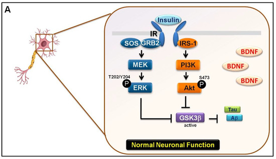Reactive oxygen species (ROS) are excessively generated in the injured brain tissue during and after TBI. This can be attributed to changes in the oxygen demand and an abnormal accumulation of cells susceptible to lipid oxidation [14]. Together with the inflammatory response, oxidative stress is supposedly the culprit that leads to neurodegenerative diseases. The aforementioned AD biomarkers can be used to study their expressions and to achieve an in vitro TBI model. Amyloid-β (Aβ) peptides generated from amyloid precursor protein are the hallmark of AD. Aβ peptides accumulate in the brain tissue of patients with AD [15]. The accumulation of Aβ peptides can affect insulin signaling [16], synaptic function, and aberrant gene expressions. In addition, the aforementioned abnormal accumulation plays a role in memory loss. Previous studies contain illustrations representing the diseased neurons with increased Aβ peptides, hyperphosphorylated Tau, alpha-synuclein, and polyglutamine [17]. Furthermore, Tau (or microtubule-associated protein Tau) and α-synuclein proteins are aggregated in AD and PD brains [18,19,20]. Besides, the change in metabolism following TBI includes an impairment of insulin signaling. Insulin and insulin growth factor (IGF) signaling in the central nervous system regulate cognitive function [21,22]. Insulin/IGF resistance in AD brain leads to decreased phosphoinositol-3-kinase (PI3K)/Akt [23,24] and Wnt/β-catenin signaling [25], as well as increased activation of glycogen synthase kinase 3β (GSK-3β). The impaired insulin/IGF signaling can also disrupt Aβ peptide accumulation [26]. In consequence, the metabolism changes and abnormal protein accumulation promotes oxidative stress in the neurons.