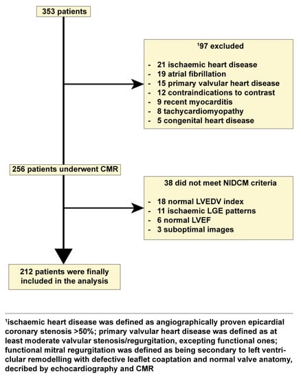 Overall, 212 patients with NIDCM (49 ± 14.2-year-old; 73.5% males) (Figure 1) and 106 healthy subjects who served as controls (49 ± 11.2-year-old; 70.7% males) were finally included in the study (Table 1).